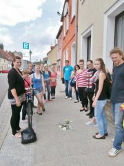 Die BBS 2 ist seit fünf Jahren unser Partner und realisierte vom 14.-17.- Juli die diesjährige Projektwoche zum Thema: Nationalsozialismus – Personen, Fakten und Schicksale. Ungewöhnlich für unsere Planung und Umsetzung! – es waren 13 weibliche Teilnehmerinnen. Die Organisatoren der Geschichtswerkstatt konstruierten vor diesem Hintergrund ein interessantes, abwechslungsreiches und emotional ansprechendes Konzept. Unterschiedliche Arbeitsmethoden (Gruppenarbeit, Aktion an einer Gedenkstätte, Vortrag mit Diskussion, Selbsterfahrung, Erstellung einer Collage) ließen den Moderatoren und Teilnehmerinnen große Spielräume zur Gestaltung. Am Beispiel des NS-Alltags gegenüber jüdischen Menschen (Anne Frank-Tag) wurden Ausgrenzung, Entrechtung bis hin zu Verfolgung und Ermordung thematisiert. Die Parallelen zu alltäglichen Rassismus, Antiziganismus und Antisemitismus wurden diskutiert. Ein Tag zum Rechtsextremismus, seinen Erscheinungsformen, der Ideologie, den Strukturen und Akteuren vor allem in unserer Region, wurde von der Koordinierungsstelle LAP (Mario Bialek) gestaltet. Stolperstein-Putz-Aktion am Neumarkt und Diskussion an der Merseburger Stele führten die jungen Frauen dann in ein Biografiegespräch mit der 85-jährigen Rosemarie Hartmann. Als Zeitzeugin des Alltags im Nationalsozialismus berichtete sie von ihren Erinnerung an das Leben in ihrer Familie, als Mitglied im BDM und die Zeit des Krieges und dessen Ende.